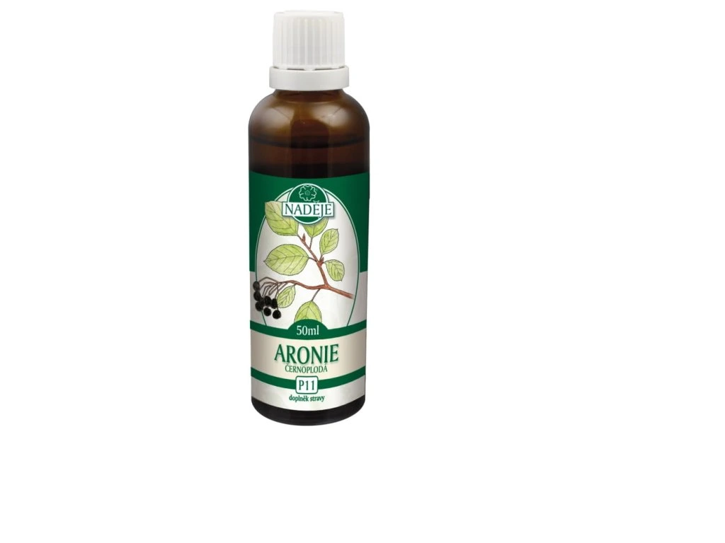 Tinktura z pupenů černého jeřábu - aronie. Plod ceněný pro vysoký obsah anthokyanů a polyfenolů. Má antioxidační účinky.