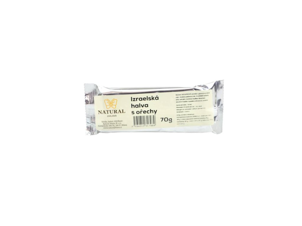 Chalva je původem orientální pochoutka z ořechů, nebo semen. Nejčastěji se s ní setkáte na trzích zemí Balkánu a zemích Blízkého východu. Tento produkt se vyrábí pouze z přírodních surovin. Neobsahuje konzervanty ani neprochází jinou chemickou úpravou. Chalva obsahuje plno kvalitních látek, jako je hořčík, železo a draslík. Chalva je vhodná také pro sportovce a malé děti, kterým navíc bude chutnat. Chalva patří mezi delikatesy! Složení SEZAMOVÉ semínko, glukózový sirup, cukr, ztužený palmový tuk, VLAŠSKÉ ořechy 10%, extrakt z kořene mydlice lékařské, SÓJOVÝ lecitin, kyselina citronová, aroma Výživové hodnoty na 100g Energetická hodnota 2290kJ/548kcal Tuky 36,00g z toho nasycené mastné kyseliny 8,00g Sacharidy 40,00g z toho cukry 30,00g Vláknina 6,00g Bílkoviny 13,00g Sůl 0,23g Skladování Skladujte na suchém místě. Země původu Izrael