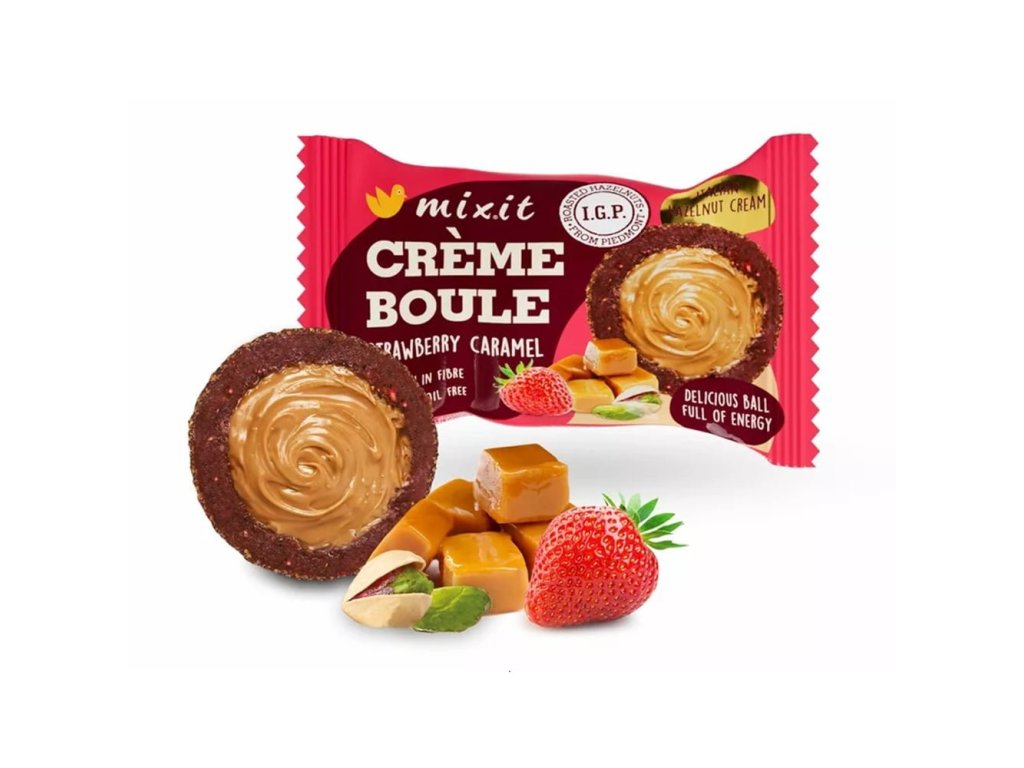 Přivítejte Crémé boule, ve francouzském překladu je to doslova krémová koule, která pod lahodnou vrstvou výběrových datlí a prachu z mrazu sušených skrývá sametový karamelový krém z piemontských lískových oříšků. Tahle koule vám při mlsání udělá jednoduše boule až za ušima, o to se postará chuťová harmonie datlí, karamelu, jahod a jemně nasekaných pistácií bez palmového oleje a bez zbytečných umělých přísad a chemie. Crémé boule jsou dokonalým zdrojem rychlého a nebesky dobré energie, kterou můžete mít vždy po ruce.