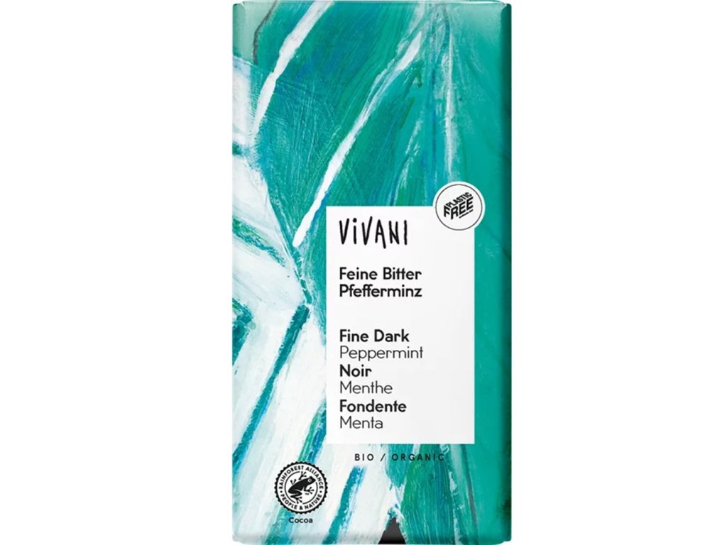 přírodní třtinový cukr, kakaová hmota, glukózový sirup, kakaový prášek, máselný tuk, kakaové máslo, mátový olej. Všechny suroviny jsou z kontrolovaného ekologického zemědělství. Obsah kakaové sušiny nejméně 68 % v čokoládě.