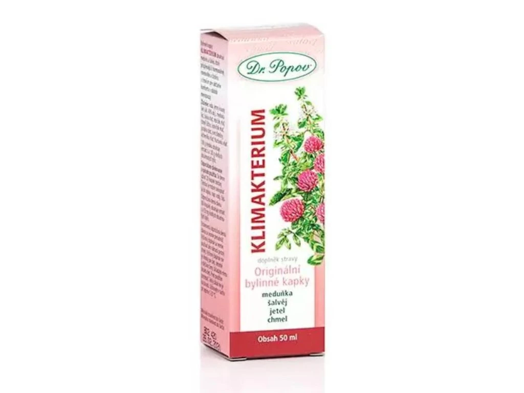 Originální bylinné kapky Dr. Popova Klimakterium v sobě spojují účinky 9 bylin, doporučovaných pro hormonální rovnováhu a pocitu pohody v období menopauzy.