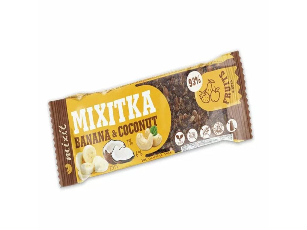Občas je to na kokos, občas to máme na banánu – a z kombinace obojího vznikla parádní Mixitka. Nepečená, ale za studena lisovaná a bezlepková. Vylepšená receptura: vyšší podíl banánu!
