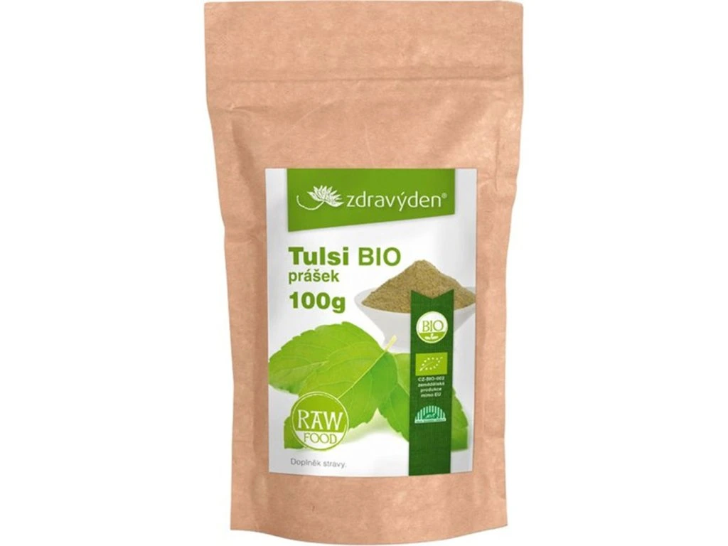 BIO a RAW tulsi prášek Zdravý den® je známá ájurvédská bylina s výraznou aromatickou a lahodnou chutí. Bazalka posvátná (Ocimum sanctum), známá jako „Tulsi“ se již po několik tisíciletí používá v systému Ajurvédské medicíny.